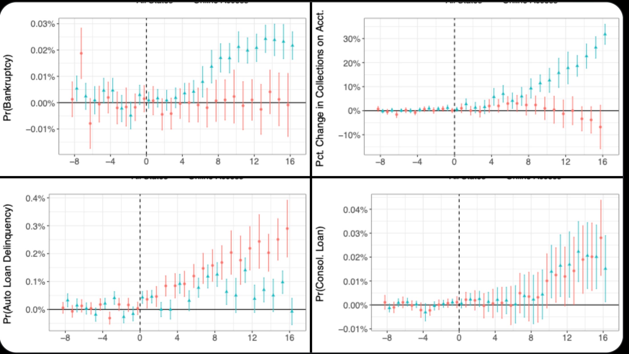 Second, several measures of excessive debt increase substantially. We find a roughly 28% increase in bankruptcies and an 8% increase in debt transferred to debt collectors. Similarly, auto loan delinquencies increase substantially as does use of debt consolidation loans.