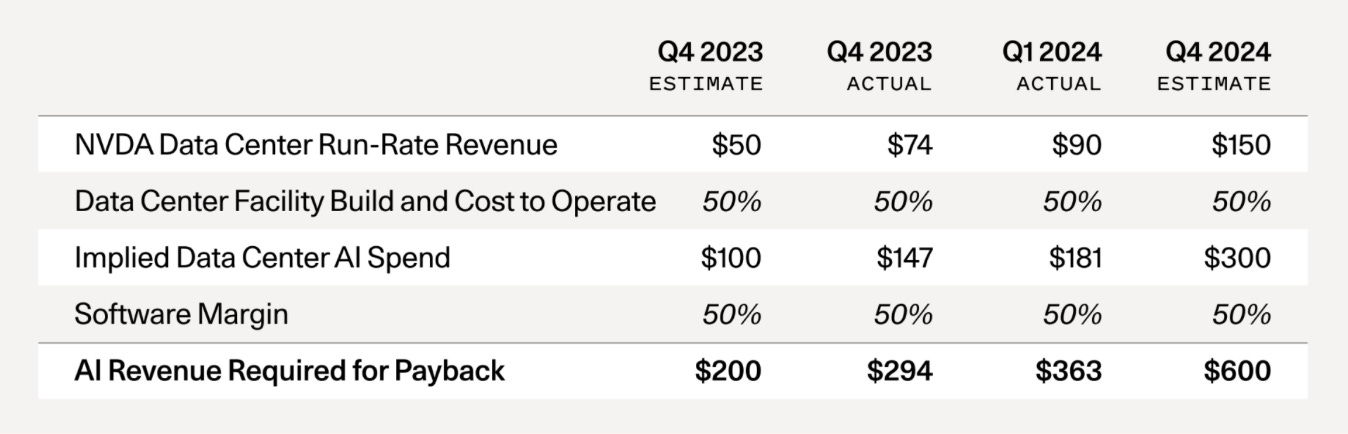 [TS] I think itâs reasonable to assume the investment-revenue gap will persistent (potentially extending well beyond Nvidia's upcoming B100 chips) given the enormous potential wealth creation of AI. The first company to achieve transformative AI capabilities is likely to reap disproportionate rewards (ie 'winner-takes-mostâ). Not hard for me to imagine boards continuing to green light current/higher levels of speculative investment given this potential for paradigm-shifting returns, even if it means sustaining short-term âlosses.â I guess weâll see either way!