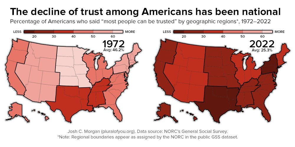 Social Cohesion Decline: Americans' trust in each other significantly decreased over 50 years