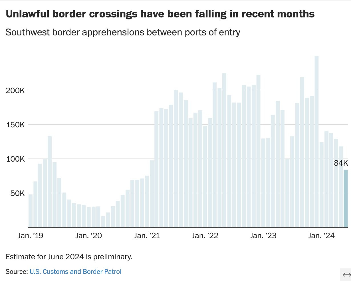 4.) CBS: Illegal border crossings are plummeting. Preliminary data for June show they're lower than they were in June 2019, Trump's last prepandemic year.
